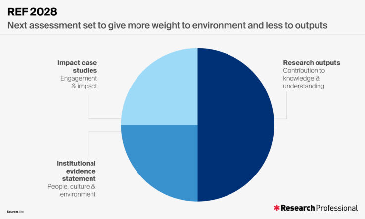 In 2028, outputs will account for 50 per cent of the assessment, down from 60 per cent in 2014. This falls short of the Gluckman review’s call for the three pillars to be equally weighted, but nevertheless represents a shift towards embracing research culture and practice as vital to any concept of research excellence. It also makes equal weightings a stronger possibility for the cycle after REF 2028.