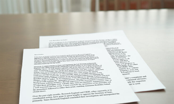 In an excoriating letter, Kamna Patel from University College London said that the national funder UK Research and Innovation (UKRI) and its constituent agency Research England had shown “no care or understanding towards external advisers” and had “gone to great lengths to appease the secretary of state”.